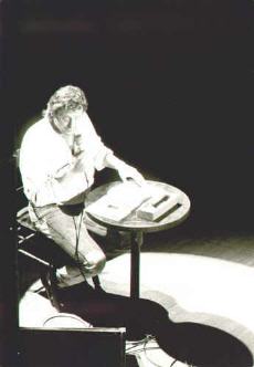 Der improvisierte Wäschetrockner kommt schon in der Pause zum Einsatz. Eigentlich müßte er öfter als zweimal am Abend angeworfen werden, denn Konstantin Wecker pflegt auch als Anfang-Vierziger noch mit unbändiger Energie und Kraft auf der Bühne zu agieren. Schon nach dem zweiten Stück umgibt ihn eine Wolke aus Schweißperlchen. Das Handtuch wird nach Flügel, Textbuch und Noten - neben der Weinflasche, aus der in unregelmäßigen