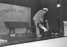 den Türken Sinasi, der übereifrig bemüht ist sich und seine türkischen Landsleute zu. .Deutschen" um zu polen, und dabei im Straßenfeger Ahmet einen nur auf den ersten Blick tumben Widerpart trifft, gespielt. Sinasi, im dunklen Anzug und mit Aktenköfferchen, schimpft seinen Landsmann einen jaulen Kümmeltürken" und macht sich flugs daran, dem jungen Mann von jenseits des Bosporus deutsche Manieren beizubringen. Das deutsche Publikum im Parkett verfolgt die langwierige Prozedur amüsiert und manchmal etwas gelangweilt.